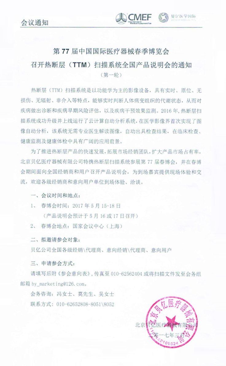 關于第77屆中國國際醫療器械博覽會 召開熱斷層(TTM)掃描系統全國產品說明會的通知 (第一輪)